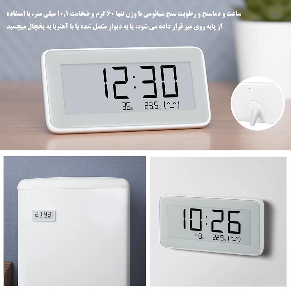 این مدل اطلاعات مهم محیطی را بهصورت یکجا نمایش میدهد:نمایش ساعت دیجیتال (قابل تنظیم ۱۲ یا ۲۴ ساعته)*نمایش دمای محیط*نمایش رطوبت نسبی هوا