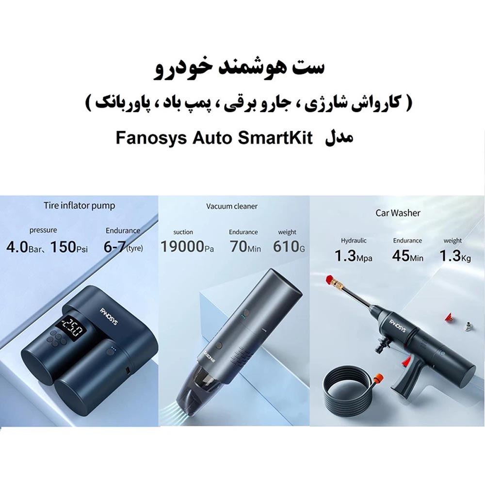 ست هوشمند خودرو ( کارواش شارژی ، جارو شارژی ، پمپ باد ) مدل Fanosys Auto SmartKit